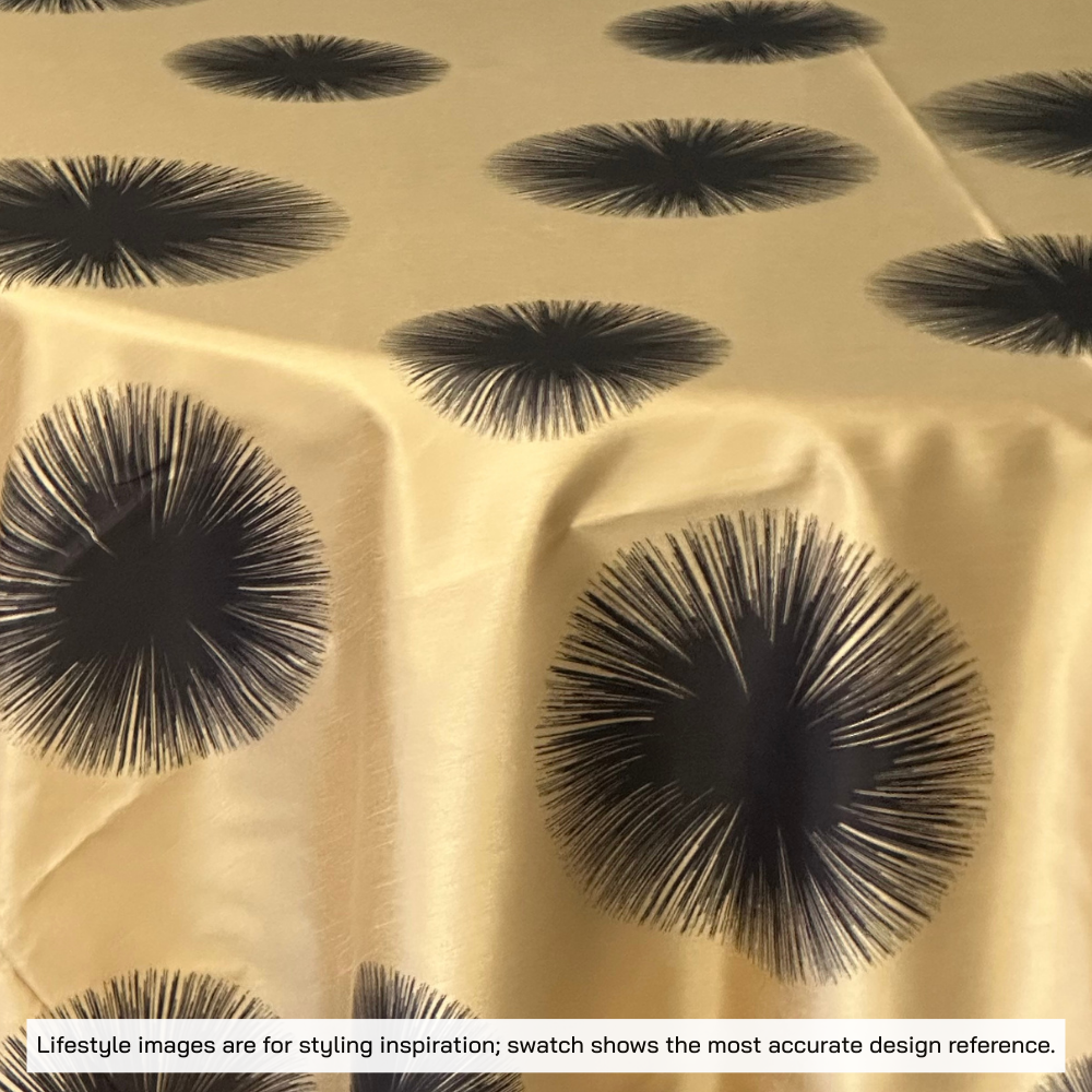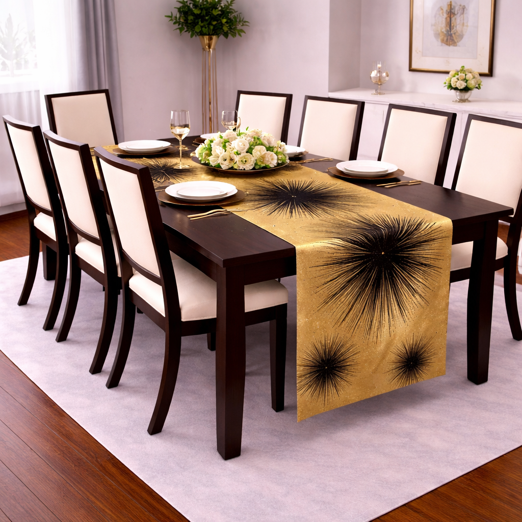 This luxury Gold tablecloth features a black center burst designed to create depth, movement, and visual drama . Perfect for upscale entertaining, formal events and couture-style tablescapes, this designer piece offers sophisticated aesthetic that feels bold yet timeless. The rich gold base paired witha deep black detailing makes it versatile center stage piece for weddings, dinner parties and statement interiors.