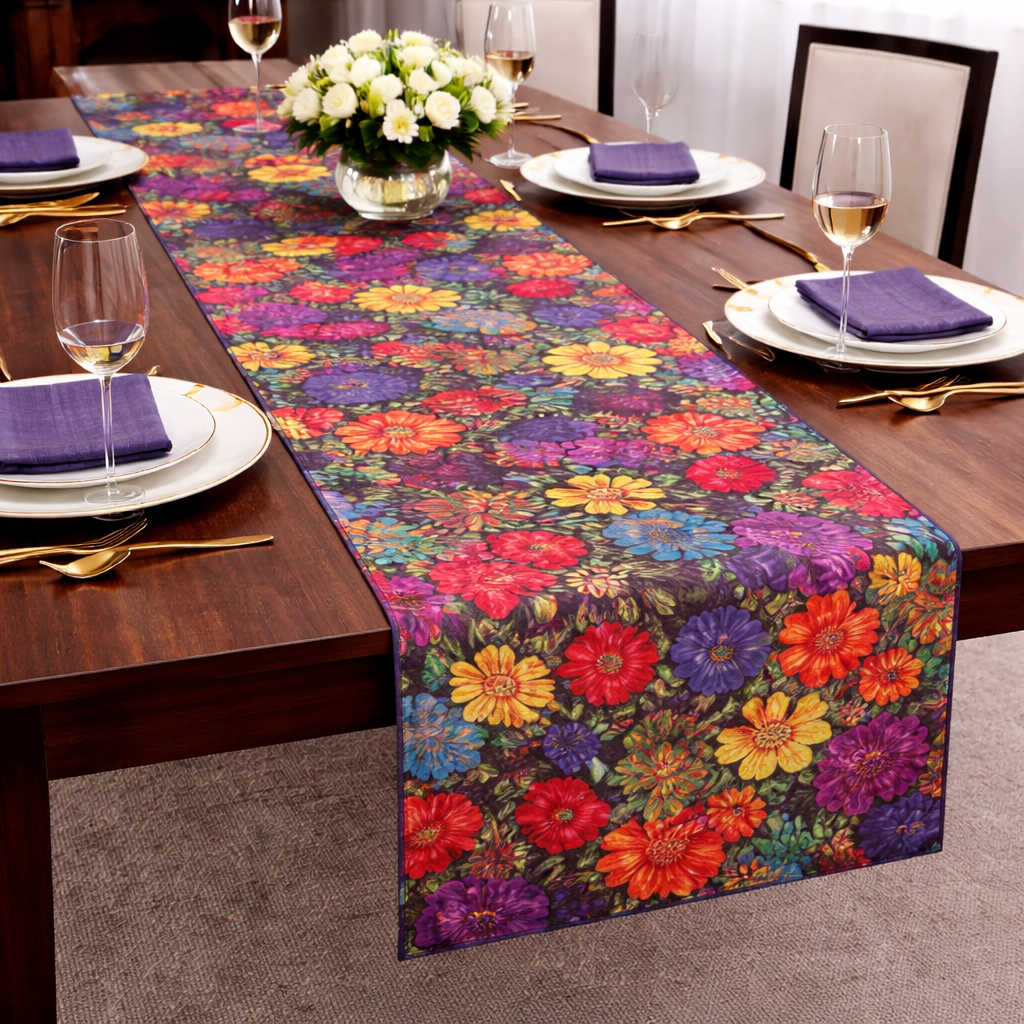 This luxury floral tablecloth is a celebration of color, artistry and refined design. Inpired by hand embroidery , the rich mix of bold hues and layered textures gives the feeling of an original artwork draped across the table. Perfect for luxury homes, editorial- style dining and exclusive events, this designer linen adds warmth, movement and a couture finish to any setting.