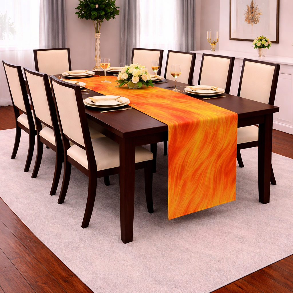 The solar Flame tablecloth wraps your table in a glowing warmth, with layered tones of gold yellow and red flowing in soft, flame-like waves. Inspired by the energy movement inside us, this designer linen brings energy, drama and passion to any setting. Perfect for luxury events, destination-inspired dinner and statement interiors, it instantly becomes the focal pointof the room. The fluid pattern adds depth and motion.