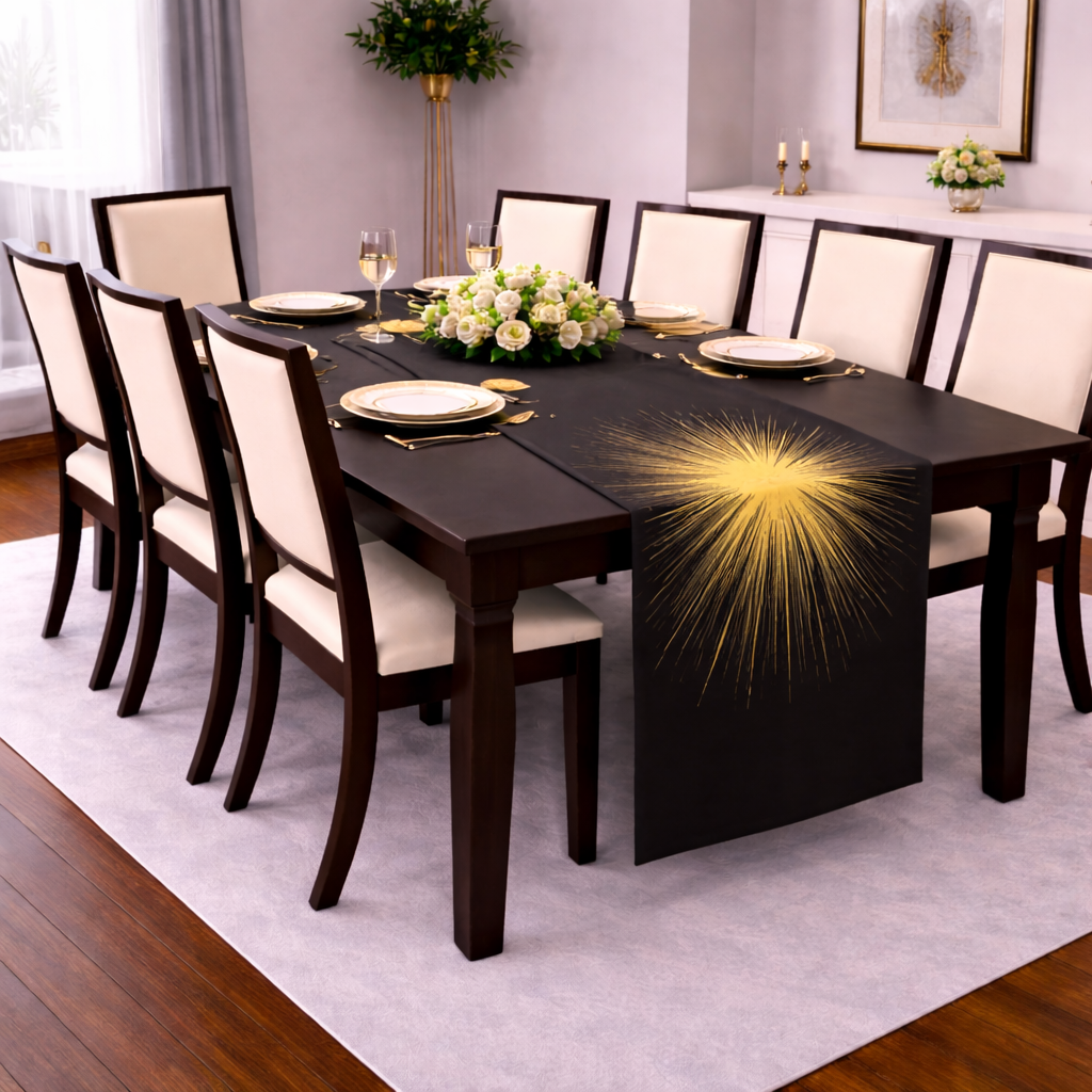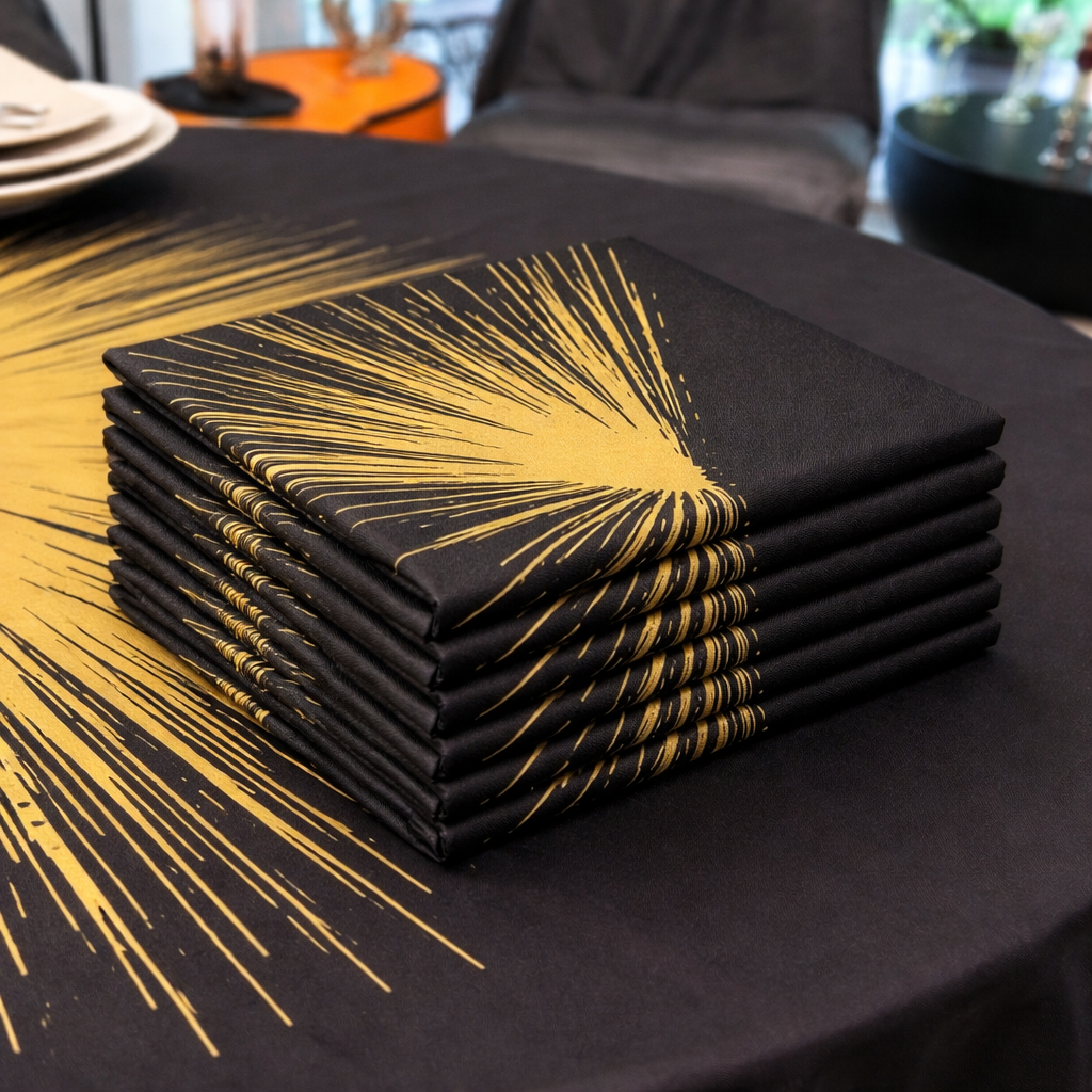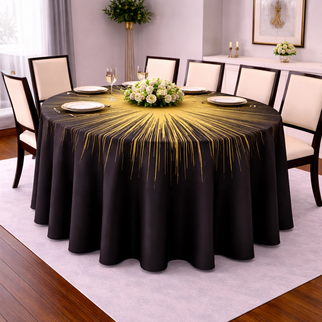 Make a bold statement with this luxury black and gold tablecloth, designed with a dramatic starburst pattern that radiates modern elegance. Crafted for high-end events, formal dining and luxury home decor, this designer table linen transform any table into a striking centerpiece. The rich contrast and artistic detail make it ideal for gala dinners, weddings, corporate events, and sophisticated gatherings. This premium tablecloth combines visual impact with refined craftsmanship, delivering an unforgetable tablescape experience.
