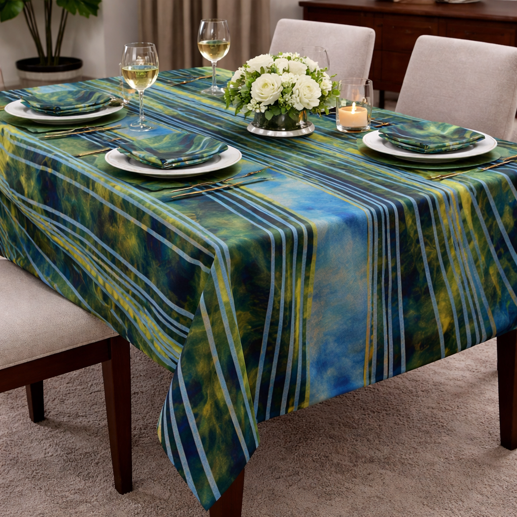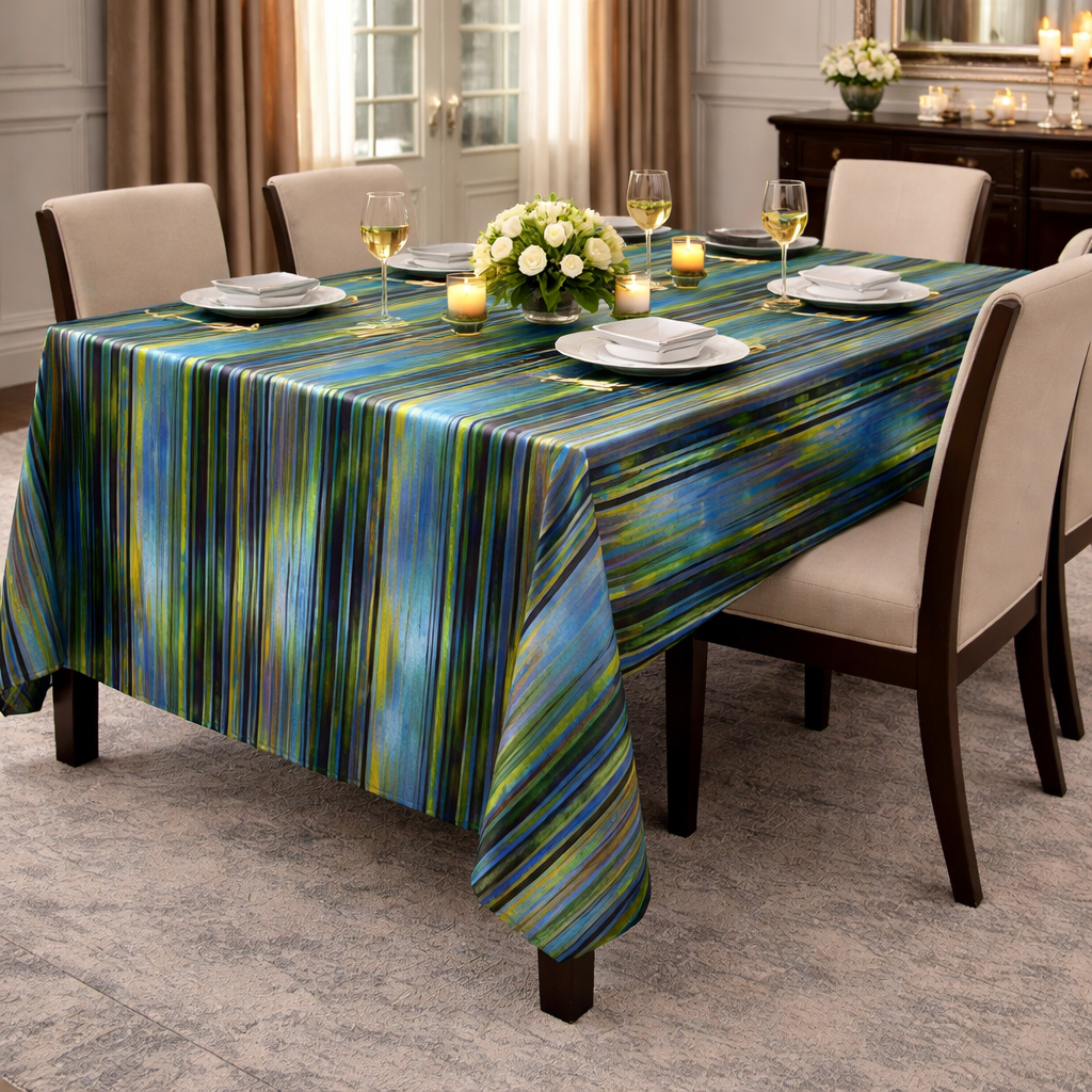 This luxury stripe tablecloth brings movement and depth to the table through fluid layers of Turquoise, Green and Navy lines Inspired by natural landscapes and rhythmic energy, the design creates a sophisticated visual flow that feels modern yet organic.Perfect for high-end events, contemporary interiors , this designer linen transforms any setting into an artistic experience.Its dynamic pattern adds, elegance and a sense of motion, making every table feel curated and exclusive.