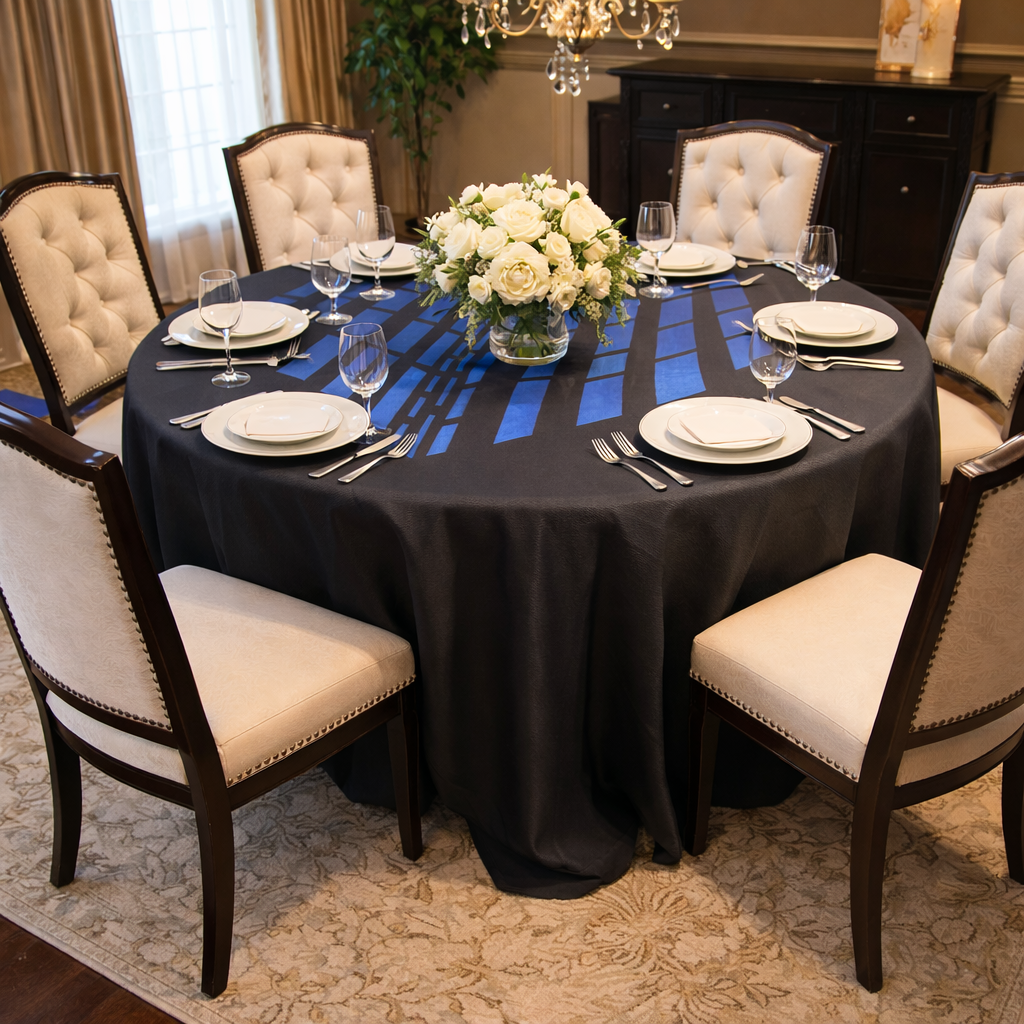 The rich black ground creates an elegant foundation, while the brilliant blue accents add a confident architectural rhythm that instantly elevates any setting. Wheter styled for an intimate event, this brings museum level inspiration to the table- an exclusive expression of color, design and unmistakable artistry.