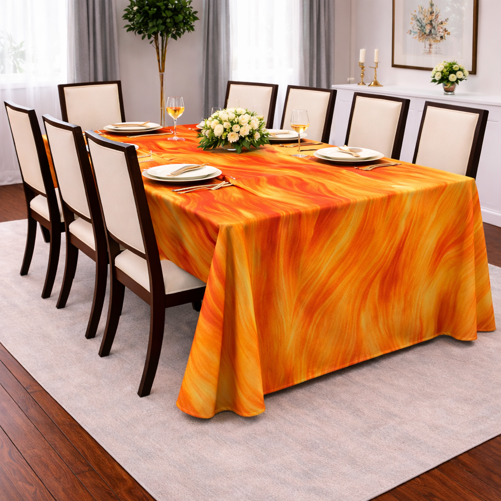 The solar Flame tablecloth wraps your table in a glowing warmth, with layered tones of gold yellow and red flowing in soft, flame-like waves. Inspired by the energy movement inside us, this designer linen brings energy, drama and passion to any setting. Perfect for luxury events, destination-inspired dinner and statement interiors, it instantly becomes the focal pointof the room. The fluid pattern adds depth and motion.
